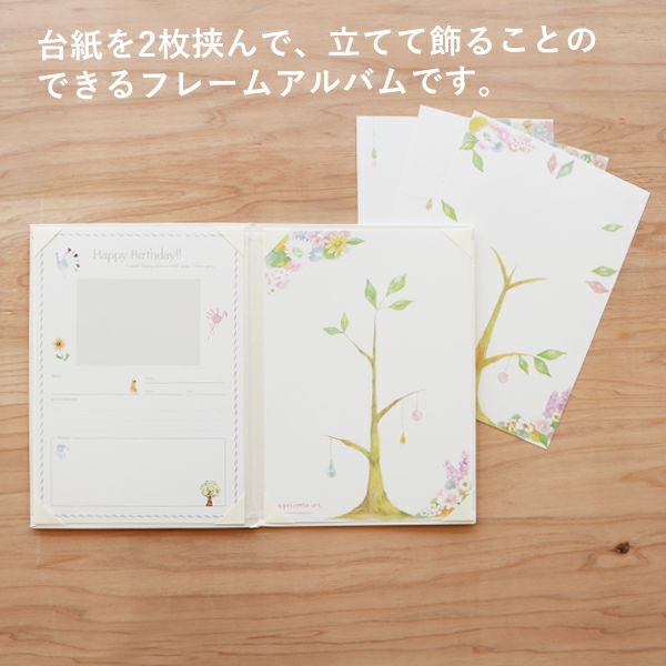 台紙を2枚挟んで、立てて飾ることのできるフレームアルバム。 表紙と裏表紙は、上品で落ち着いた色合いのパールホワイトの生地で覆われたクッションの入った上質なつくりのフレームアルバムです。
