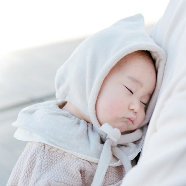 ちいさな頭に添うように後ろ部分にはゴムが入っており